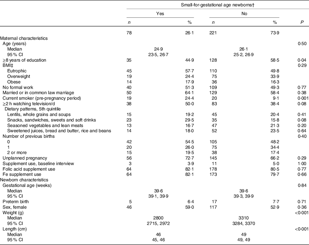 Overall, the prevalence of SGA newborns was 26·1 % (78/299), where 29·5 % (23/78) of them presented both birth weight and length <10th percentile, 64·1 % (50/78) presented only birth length <10th percentile and 6·4 % (5/78) presented only birth weight <10th percentile. When compared with mothers of non-SGA newborns, mothers of SGA newborns had less years of formal education and were more frequently smokers in the pre-pregnancy period (Table 2). When compared the SGA newborns with the ones who were not, no differences in the proportion of sexes and prematurity were verified. As expected, smaller median values of birth weight and length were verified for the SGA newborns in relation to the non-SGA ones (Table 2).