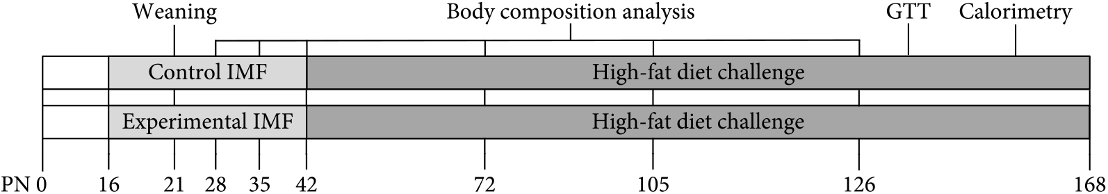 Fig. 1. Study design from postnatal days (PN) 0–168 (n 12). GTT, glucose tolerance test; IMF, infant milk formula.