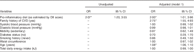 Descriptive statistics were used to identify the key characteristics of the sample. As our a priori hypothesis was that a pro-inflammatory diet would be associated with greater odds of a CHD event when compared with (what has been shown to be a cardio-protective diet) an anti-inflammatory dietary intake, DII scores were dichotomised such that positive values represented more pro-inflammatory diets and negative scores reflected more anti-inflammatory diets. Using methods described by Hosmer & Lemeshow( Reference Hosmer and Lemeshow 22 ), logistic regression was performed to examine the predictive effect of DII grouping at baseline (where anti-inflammatory dietary intake was treated as the referent group) on the primary outcome of the occurrence of a 5-year CVD event.