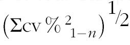 $$\left( {\Sigma {\rm cv}\,\%\,^{{\rm 2}} _{{\ {\rm 1}{\minus}n}} } \right)^{{{\raise0.7ex\hbox{$1$} \!\mathord{\left/ {\vphantom {1 2}}\right.\kern-\nulldelimiterspace}\!\lower0.7ex\hbox{$2$}}}} $$