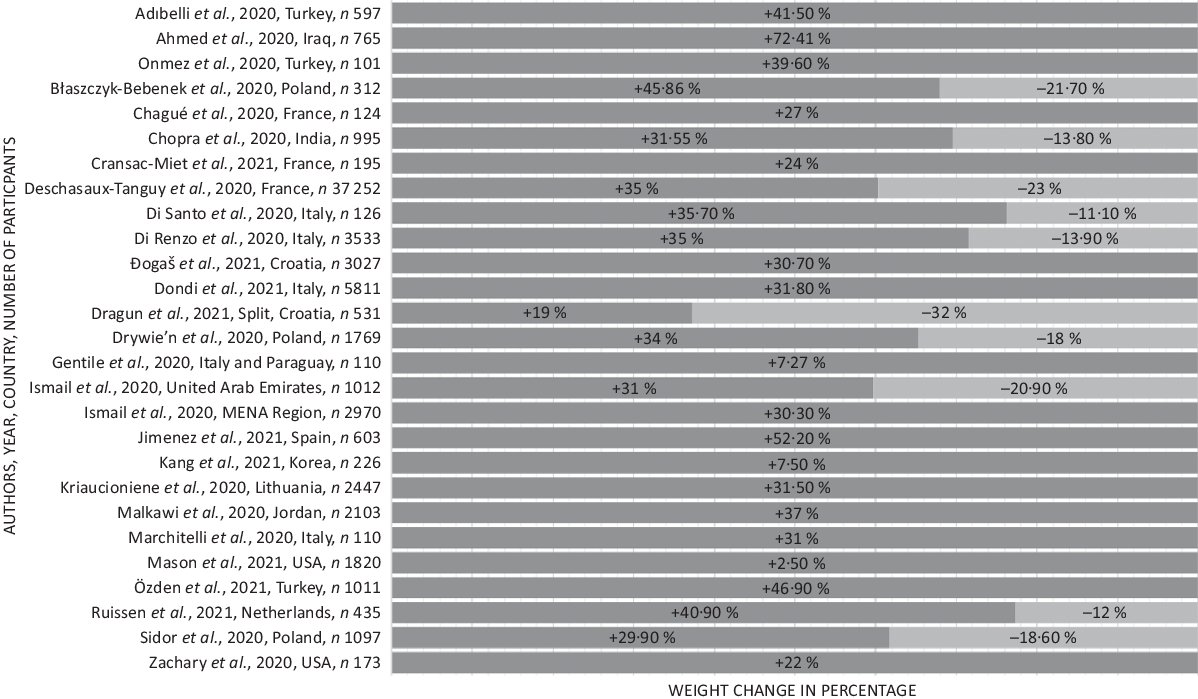 In our study, 7·2–72·4 % of all participants including both adults and children experienced an increase in body weight during the confinement periods(Reference Di Renzo, Gualtieri and Pivari20,Reference Pellegrini, Ponzo and Rosato22,Reference Sidor and Rzymski24,Reference Zachary, Brianna and Brianna25,Reference Cheikh Ismail, Osaili and Mohamad32,Reference Di Santo, Franchini and Filiputti34–Reference Drywień, Hamulka and Zielinska-Pukos36,Reference Kriaucioniene, Bagdonaviciene and Rodríguez-Pérez38–Reference Athanasiadis, Hernandez and Hilgendorf40,Reference Ozden and Parlar Kiliç42–Reference Deschasaux-Tanguy, Druesne-Pecollo and Esseddik51,Reference Chopra, Ranjan and Singh54,Reference Jia, Zhang and Yu56–Reference Gentile, Torales and O’Higgins61,Reference Dogas, Kalcina and Dodig63–Reference Blaszczyk-Bębenek, Jagielski and Boleslawska67) (Fig. 2). The mean weight gain ranged from 0·6 (sd 1·3) to 3·0 (sd 2·4) kg. There was a higher weight gain among participants who self-reported stress(Reference Zachary, Brianna and Brianna25,Reference Marchitelli, Mazza and Lenzi44,Reference Chopra, Ranjan and Singh54,Reference Cransac-Miet, Zeller and Chagué55,Reference Malkawi, Almhdawi and Jaber57,Reference Ahmed60,Reference Gentile, Torales and O’Higgins61) , anxiety and depression(Reference Pellegrini, Ponzo and Rosato22,Reference Deschasaux-Tanguy, Druesne-Pecollo and Esseddik51,Reference Malkawi, Almhdawi and Jaber57,Reference Ahmed60,Reference Gentile, Torales and O’Higgins61) . Weight loss was observed in 11·1–32·0 % of participants(Reference Di Renzo, Gualtieri and Pivari20,Reference Sidor and Rzymski24,Reference Cheikh Ismail, Osaili and Mohamad32,Reference Di Santo, Franchini and Filiputti34,Reference Drywień, Hamulka and Zielinska-Pukos36,Reference He, Xian and Lv39,Reference Dragun, Veček and Marendić50,Reference Deschasaux-Tanguy, Druesne-Pecollo and Esseddik51,Reference Chopra, Ranjan and Singh54,Reference Ruissen, Regeer and Landstra59,Reference Onmez, Gamsızkan and Özdemir64,Reference Blaszczyk-Bębenek, Jagielski and Boleslawska67) . The mean experienced weight loss ranged from 2·0 (sd 1·4) to 2·9 (sd 1·5) kg.
