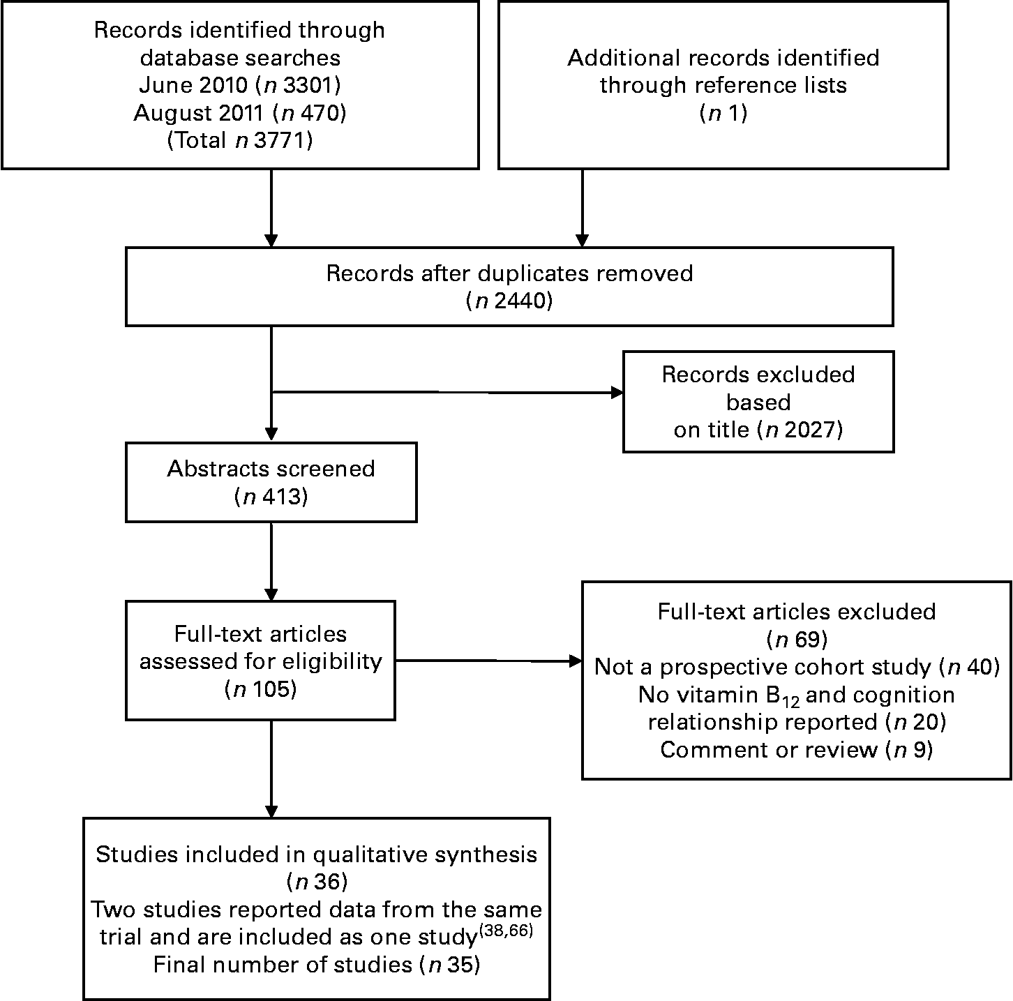 The most recent systematic reviews include studies published before 2007(Reference Balk, Chung and Raman19, Reference Raman, Tatsioni and Chung21) and only include studies assessing vitamin B12 concentrations. Other studies that utilise sensitive biomarkers of vitamin B12 status, holoTC and MMA, have since been published. The aim of the present systematic literature review was to provide an up-to-date identification and critical appraisal of published studies of the longitudinal association between vitamin B12 status and the spectrum of cognitive decline and dementias in older adults.