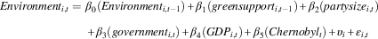 Several pooled time-series cross-section models are estimated with ordinary least squares to assess the impact of radical right and green party support on mainstream party policy agendas. In order to account for serial correlation and panel-specific heteroskedasticity the models include a lagged dependent variable, and panel-corrected standard errors are calculated.Footnote 50 The lagged dependent variable also has a substantial meaning since party manifestos are not always written from scratch, but are heavily based on previous manifestos. All models also include party-dummy fixed effects to account for unit-specific heterogeneity. The inclusion of the fixed effects reduces the analyzed variation to within-party variation over time, and thus controls for time-constant party- and country-specific particularities. The following two basic models are estimated for issue position and salience, respectively: