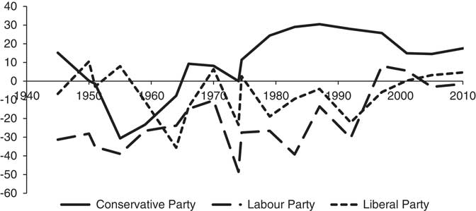 One potential reason why the working class may have become disillusioned with voting is, as already discussed, to do with the structure of policy offerings between the two main parties. Figure 3 shows how the main parties in Britain have shifted their left–right policy positions over the last half a century. During the post-war consensus of the 1950s and 1960s there was little ideological difference between the Conservative and Labour positions, though from the mid-1950s both parties moved right towards the centre ground. During the 1970s the Labour party moved substantially to the left and stayed there for the best part of twenty years, opening up a clear ideological divide between the two main parties. Since 1992, and in particular since 1994 when Tony Blair took over the leadership of the party there has been a process of policy convergence, with the Labour party moving towards the centre ground, and the Conservatives moving somewhat to the left.