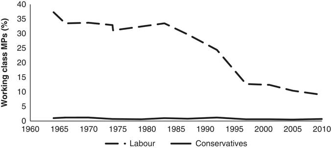 Figure 4 depicts the changes that have taken place in the social background of Labour and Conservative MPs over the last fifty years. The number of MPs with a background in manual work has fallen dramatically.Footnote 78 In 1964 over 37 per cent of Labour MPs came from manual occupational backgrounds. By 2010 this fell to just under 10 per cent. These changes can be traced to institutional changes that were implemented by Kinnock in a bid to modernize the Labour party during the 1980s. As part of an effort to rebrand the party in order to appeal to middle-class voters and distance the party from the working-class radicalism that it had come to be associated with, more and more middle-class candidates were put forward. For example, in 1992 58 per cent of incumbent Labour candidates thought of themselves as working-class, compared to just 45 per cent of newly selected candidates.Footnote 79