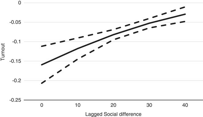 These results are robust to the inclusion of the main alternative hypotheses. Model 5 tests policy alienation and social alienation hypotheses simultaneously.Footnote 84 The main results still stand up. Footnote 85 The magnitude of the coefficient for the interaction term between lagged social difference and working-class is stable across models. These findings show that once we take social representation into account the strength of the class–turnout association does not vary by policy alienation (or policy indifference).