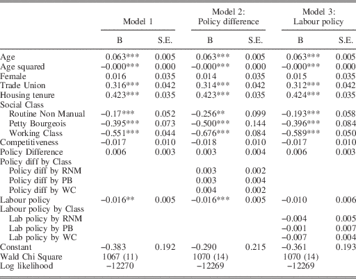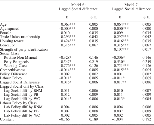 In order to model the extent to which social classes differ in their voting behaviour I do not control for any attitudinal variables that may be endogenous to class at the individual level or policy difference and social difference at the party level, such as leadership evaluations, economic evaluations or party identification. For example, social differences at the party level may influence party identification at the individual level, and so party identification may be a consequence of social differences (though see robustness checks for Models 6 and 7 in Table 3 below).