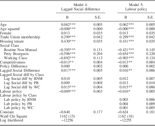 Five different models are specified. Model 1 is simply a baseline model of turnout which does not include any class-wise interactions; Model 2 specifies class-wise interactions to test the impact of policy difference on class turnout; Model 3 tests the impact of Labour policy on class turnout; and Model 4 tests the impact of social difference on class turnout. Model 5 tests the impact of social difference and labour policy simultaneously. The relevant parameter estimates from these models are reported in Tables 1 and 2.