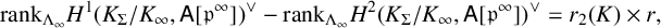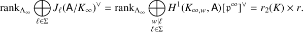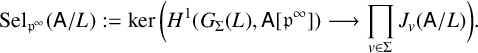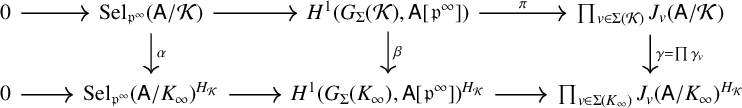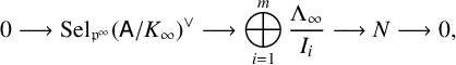 $$ \begin{align} ( \mathrm{Sel}_{\mathfrak{p}^\infty}(\mathsf{A}/K_\infty)^\vee)_{H_{\mathcal{K}}}\simeq\bigoplus_{i=1}^m\frac{\Lambda_{\mathcal{K}}}{\left(\pi_{\mathcal{K}}(f_i)\right)}\twoheadrightarrow\mathrm{Sel}_{\mathfrak{p}^\infty}(\mathsf{A}/\mathcal{K})^\vee. \end{align} $$