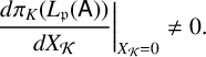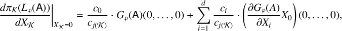 $$ \begin{align*} & \pi_{\mathcal{K}}(f_i)=\sum_{k\ge m(i)}G_{i,k}((1+X_{\mathcal{K}})^{{c_1}/{c_j(\mathcal{K})}}-1,\ldots, (1+X_{\mathcal{K}})^{{c_d}/{c_j(\mathcal{K})}}-1)\pi_{\mathcal{K}}(X_0)^k\\ &\quad =G_{i,m(i)}((1+X_{\mathcal{K}})^{{c_1}/{c_j(\mathcal{K})}}-1,\ldots, (1+X_{\mathcal{K}})^{{c_d}/{c_j(\mathcal{K})}}-1)\bigg(\frac{c_0}{c_j(\mathcal{K})}X_{\mathcal{K}}\bigg)^{m(i)}+O(X_{\mathcal{K}}^{m(i)+1})\\ &\quad =G_{i,m(i)}(0,\ldots, 0)\bigg(\frac{c_0}{c_j(\mathcal{K})}X_{\mathcal{K}}\bigg)^{m(i)}+O(X_{\mathcal{K}}^{m(i)+1}) \ne0. \end{align*} $$