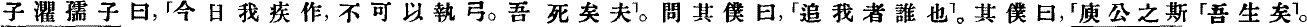 page 129 note 1 Another case in which the placing of ^Sj is significant is found in Mencius:— No. 49. Legge, 329/4 Tzyyjwo Ru said,’To-day I am ill, and cannot hold my bow. Shall I not die?’ He asked his driver, ‘Who is it that is pursuing me?’ His driver said, ‘It is Yeugong Sy’. He said ’ I shall live ‘. If were an exclamatory particle, it would be as appropriate after the latter assertion (expressing relief that he will live) as after the former (expressing his emotion at the prospect of death).