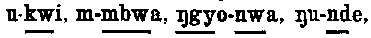 All ‘ sequences of consonants ’ (‘ consonant ’ here means anything except a, e, i, o, u) are, like all simple consonants, homosyllabic with the following vowel, except that (a) the first consonant of a gemination is syllabic, e.g. ∫a-l-lo-la, k-kyo, m-mwa, and (b) nasals are syllabic before voiceless consonants, with which they are then homorganic, e.g. n-su, m-fu, a-ŋ-xe-ka. All homosyllabic ‘ sequences ’ arise from the linear representation of the prosodies of nasalization, labiovelarization, and yotization: this ‘ orthographic ’ transcription has been adopted here in order that attention may be more readily concentrated on the subject of the paper. Thus,