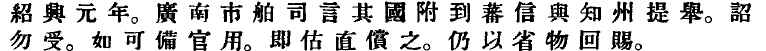 ‘In the first year of the chao hsing period (1131–63) the Kuang Nan trade commissioner reported that this country (i.e. Cambodia) had sent a letter (by messenger). The letter had been handed over to the chih chou t‘i chü. The imperial instruction was that the (gifts) should not be accepted. If any of these goods were in the category of “official goods”, their value should be estimated and paid for. Moreover gifts from the province should be given in return.’