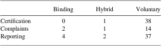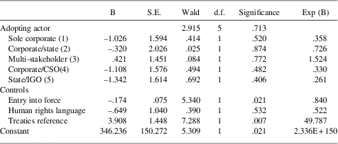 Our preliminary results suggest that all three explanations may be important. First, the presence of other adopting actors seems particularly relevant. Excessive participation of corporations (corporate control) is likely to lead to the recognition of less human rights and a lower likelihood of complaint mechanisms. However, this does not mean that corporations should be necessarily excluded from drafting processes. It seems unlikely that the agenda can be moved forward in a strong and sustained manner unless there is a strong groundswell of market and regulatory support for greater regulation. Only states are well positioned to develop standards of this nature, and they may be just as inclined to support oppositional corporate perspectives. Thus, strategies that seek to impose greater costs on corporations that do not move forward on regulatory initiatives may be particularly effective rather than just focusing on who is in the room.Footnote 88
