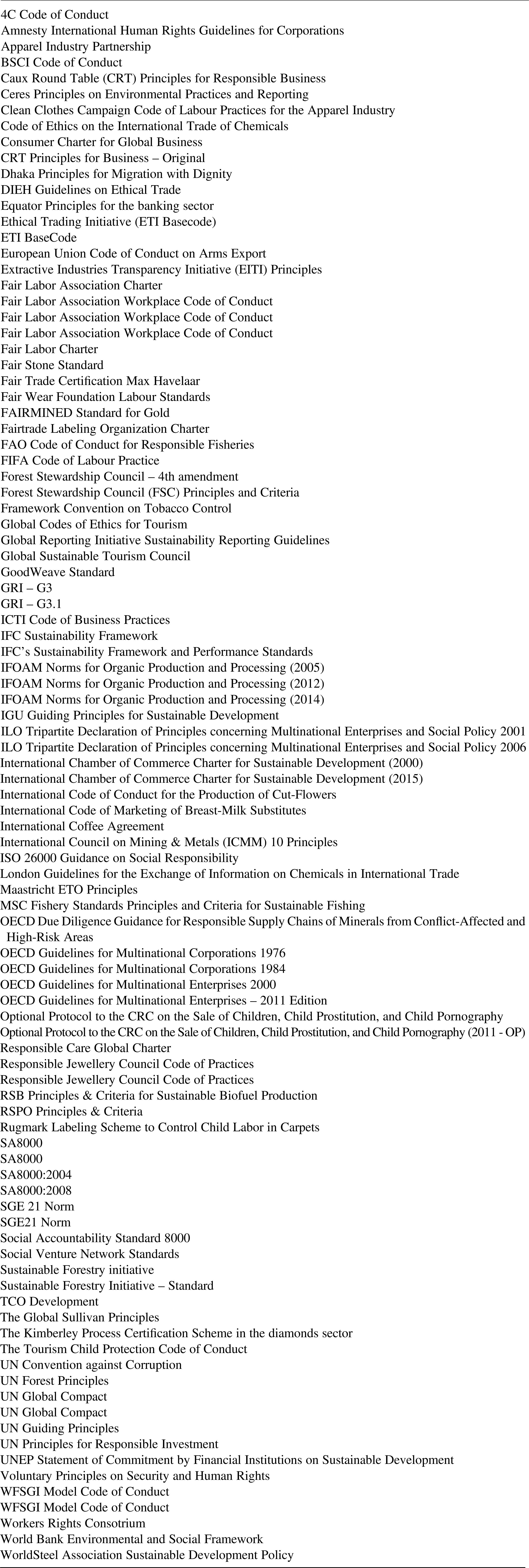 Given the high number of both technical and single enterprise standards, we have narrowed our selection in order not to overstate the relevant sample. The potential candidates for inclusion were first identified through keyword searches on international search engines, primarily Google, as well as a review of online lists targeted at corporations and states, e.g., by the Business & Human Rights Resource Centre.Footnote 19 To be included in our database, the following requirements had to be met. First, a standard must be global and transnational. This means that it must extend beyond one jurisdiction and one corporation, which results in the exclusion of national regulations and corporate codes of conduct for a single enterprise.Footnote 20 Second, a standard must have direct and explicit implications for corporations. This requirement results in the exclusion of international treaties that only indirectly implicate corporate behaviour, such as via the duties of states to regulate, e.g., the International Covenant on Economic, Social and Cultural Rights (ICESCR).Footnote 21 Third, in order to exclude merely technical concerns (e.g., auditing, finance), we have only included standards that include a focus on the social responsibility of corporations and the physical impact that corporations have on workers, consumers or other stakeholders through their operations. Although many technical standards may have social implications, they are not included in the database at this stage.