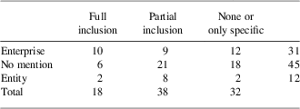For the enterprise approach, the inclusion of human rights is evenly distributed among the three categories, while for the other two approaches the distribution is more skewed towards partial or no inclusion. This was unexpected. Standards with the enterprise approach are comparatively stronger on human rights protection, possibly contradicting the idea of a commitment curve. However, this finding is dependent on how the ‘no mention’ category is understood. If interpreted to cover the enterprise, the result would be the reverse. Nonetheless, it is interesting on this vector that 10 of 18 instances for full human rights inclusions occur for standards applying to the entire corporate enterprise.Footnote 71