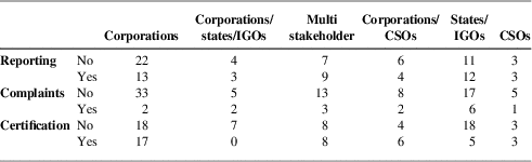 Turning to accountability mechanisms, Table 6 shows their distribution across the different constellations of adopting actors. Certification is certainly the most preferred accountability mechanism when corporations are sole adopters. Considering that certification is specifically targeted within economic sectors, it is less surprising that corporations prefer this model. On the other hand, corporations are the least likely to establish complaints mechanisms in global standards.Footnote 76 The dispute mechanisms are concentrated in multi-stakeholder and IGOs/states instruments. Unlike certification mechanisms (which can enhance market access and brand reputation), corporations may consider complaint mechanisms to bring only costs. On periodic reporting, the distribution is more equal. However, it is difficult to rank periodic reporting at the same strength as mechanisms of certification and complaints: the former tends to permit less external and specific scrutiny of corporate practice.Footnote