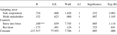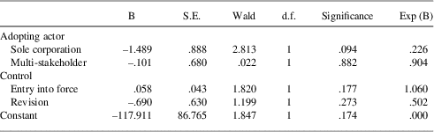 Similar to certification, there are limited significant findings on the role of adopting parties in affecting the presence of complaint mechanisms, as shown in Table 7B. However, at a 10 per cent level there is a negative relationship between sole corporate adoption and complaint mechanisms. This supports the assumption that corporations are less prone to adopt standards that include complaints mechanisms, at least without the involvement of other actors. Similar to the analysis of certification, there is a positive relationship between when the standard entered into force and the inclusion of a complaints mechanism indicating a move towards increased accountability. However, this is not significant.