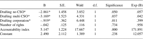 SimmonsFootnote 78 and SauvantFootnote 79 have shown the importance and power of CSOs in mobilizing for change and strengthening protections in the international human rights systems. Considering this, one may assume that their presence in drafting would strengthen human rights protections and accountability mechanisms. To see if the presence of CSOs in drafting influenced the inclusion of human rights, a test was run on the relationship between human rights scope and drafting actor, but there were no significant findings. This was surprising given the results on adopting actors, suggesting that mere civil society presence may not be particularly significant in influencing states and corporations. This raises some questions regarding the expressive expectations about simply bringing non-governmental voices into the debate.