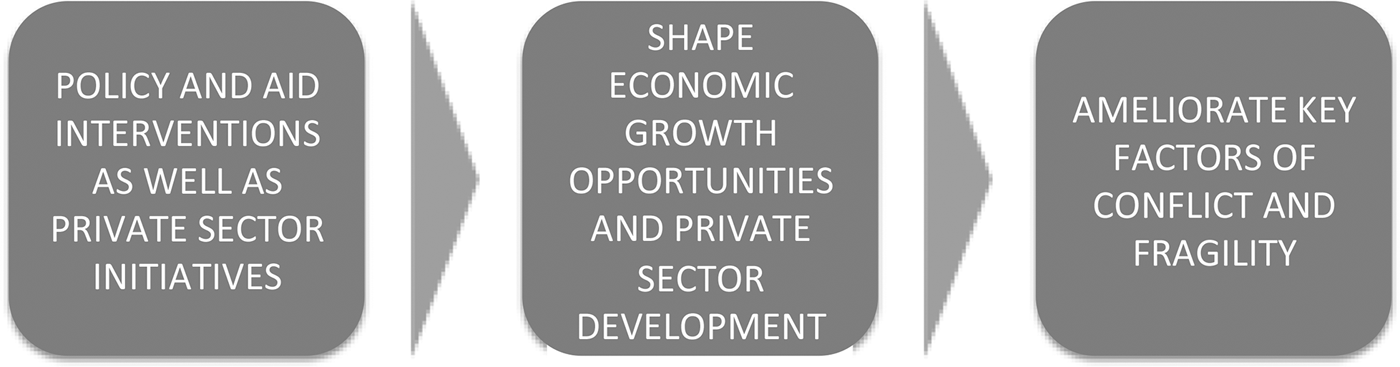 The model posits that policy and aid interventions shape economic growth opportunities and private sector development in ways that ameliorate key factors of conflict and fragility in a linear fashion.Footnote 57 This is captured in the shorthand of the World Bank, as one leading example, as private sector contributions to “security, justice and jobs.”Footnote 58 At the economic policy level, austerity measures are posited to create conditions of macro-economic stability in which more companies invest, in turn creating tax revenues that can be spent on public needs to build state legitimacy. At the level of the business and investment climate, infrastructure investments are said to break down barriers to private sector opportunity; at the enterprise level, project finance for mining projects, or export-oriented plantations supposedly create jobs that increase resilience. Such efforts to promote the private sector are increasingly key development strategies of FCAS in pursuit of the Sustainable Development Goals.Footnote 59
