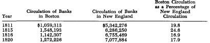 These figures show the possible proportion of notes of Boston banks to the notes of all New England banks for 1811, 1815, 1816, and 1820. As revealed by the data, Boston's bank notes as a proportion of total notes declined slightly from 1811 to 1820. However, this pattern of change may not have held for the money supply of Boston. These data indicate only what might have been the case for New England generally; but since the proportion of all city notes that circulated in Boston probably exceeded the proportion of all country bank notes that likewise formed part of Boston's currency, the above percentages most likely overstate the dominance of foreign money in that city. On the other hand, the author derived the number of country bank notes in circulation in New England by applying the reported ratio of note circulation to bank capital for Massachusetts country banks to the known banking capital of New England. This probably understates the note issues of several of the states, for the Massachusetts banks followed a more conservative policy in note circulation than did their counterparts elsewhere. Consequently, these figures represent only crude estimates (Bankers' Magazine, V, New Series [February, 1856], 623).