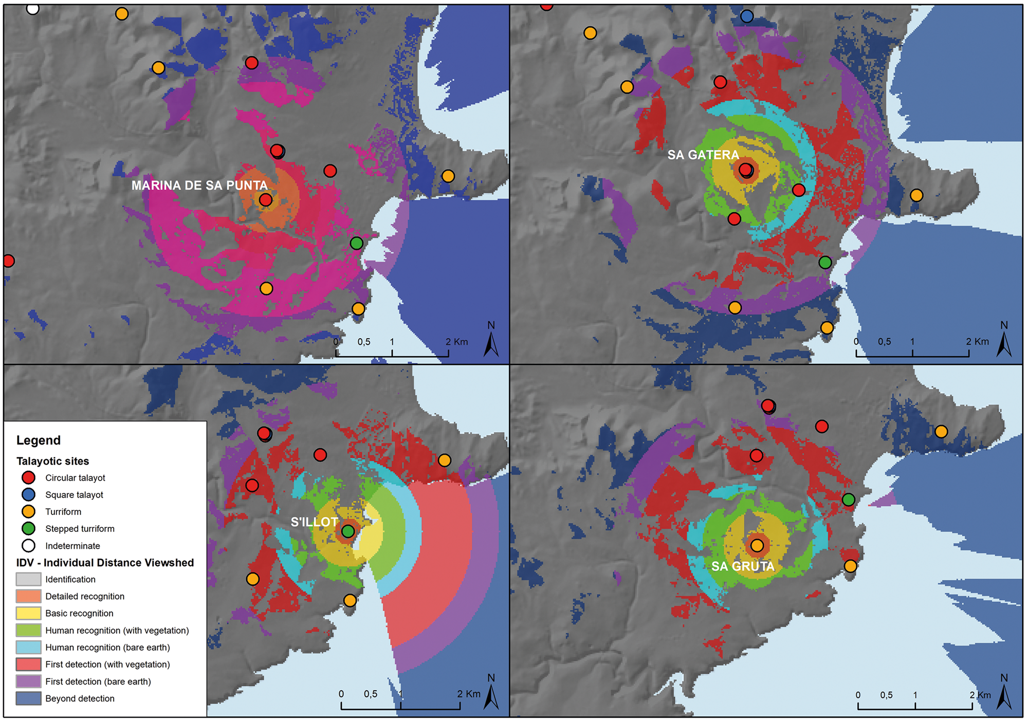Figure 2. Individual Distance Viewshed (IDV) of the sites of Marina de Sa Punta, Na Gatera, S'Illot and Sa Gruta, in the northeast area of study.