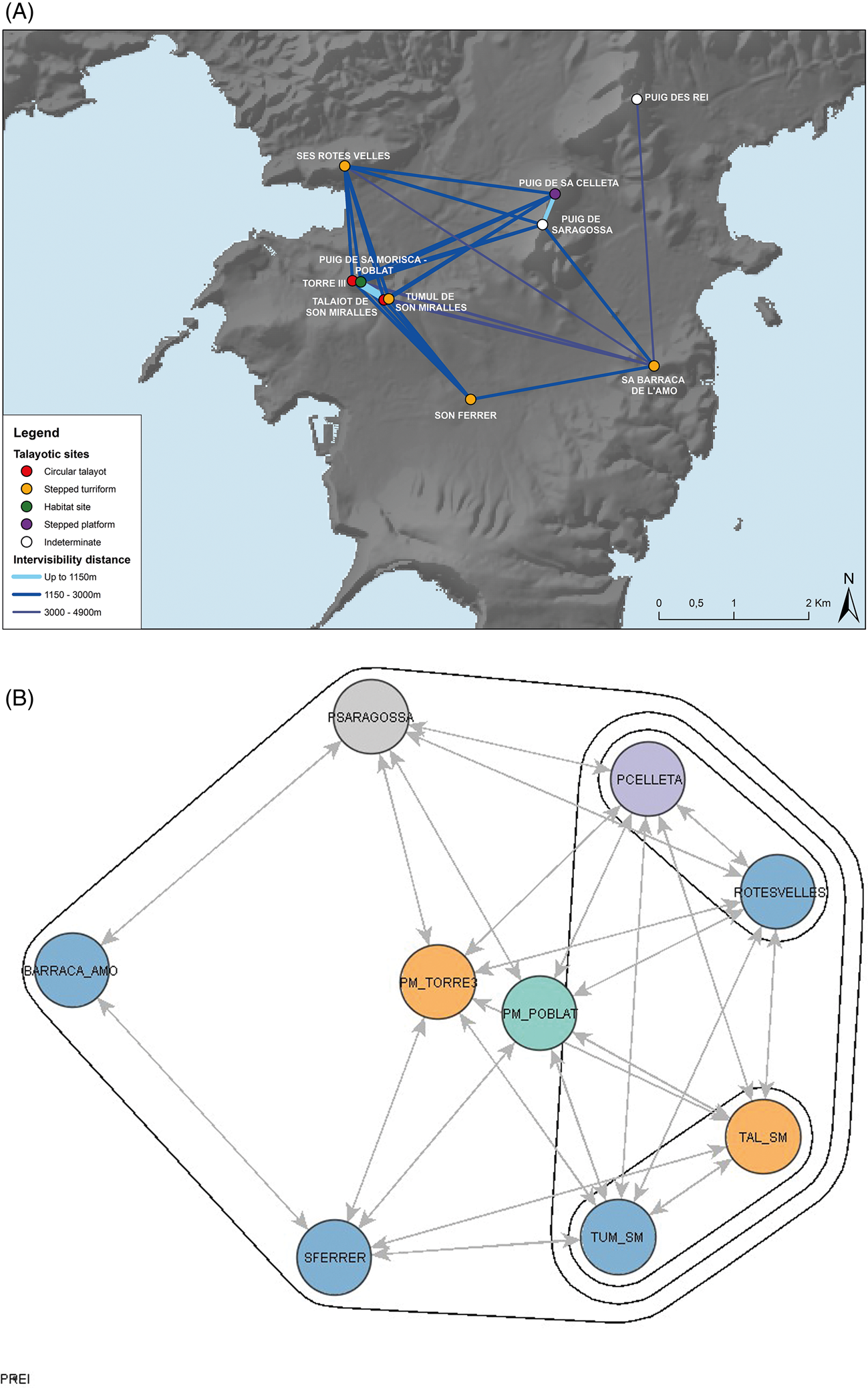 In both cases several stepped turriforms delineate the network, either located in high altitude places, such as Puig de Sa Celleta or Es Puig – Ses Talaiasses, or in visually prominent places, as Ses Rotes Velles, Sa Barraca de l'Amo, Punta de n'Amer or Cala Morlanda. Moreover, in both cases the central site of the visual network presents a circular talayot, both in Puig de Sa Morisca and in Marina de Sa Punta. Both sites also show an occupation that begins during the Bronze Age (Albero Santacreu et al. Reference Albero Santacreu, Calderón Díaz, Calvo Trías, Gloaguen Murias, Calvo Trias and Aguareles Garcia2011; Garcia Amengual Reference Garcia Amengual and Riera Rullan2012; Guerrero et al. Reference Guerrero Ayuso, Calvo Trias, García Rosselló and Gornés Hachero2007; Rosselló Bordoy Reference Rosselló Bordoy1989).