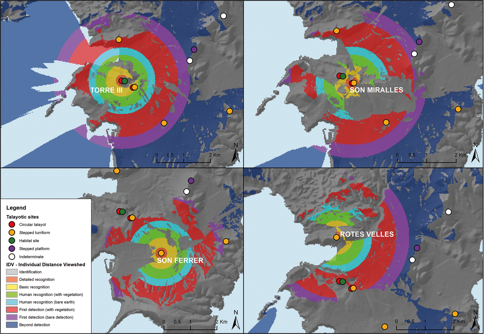 Figure 5. Individual Distance Viewshed (IDV) of the sites of Torre III (Puig de Sa Morisca), Son Miralles, Son Ferrer and Ses Rotes Velles, in the southwest area of study.