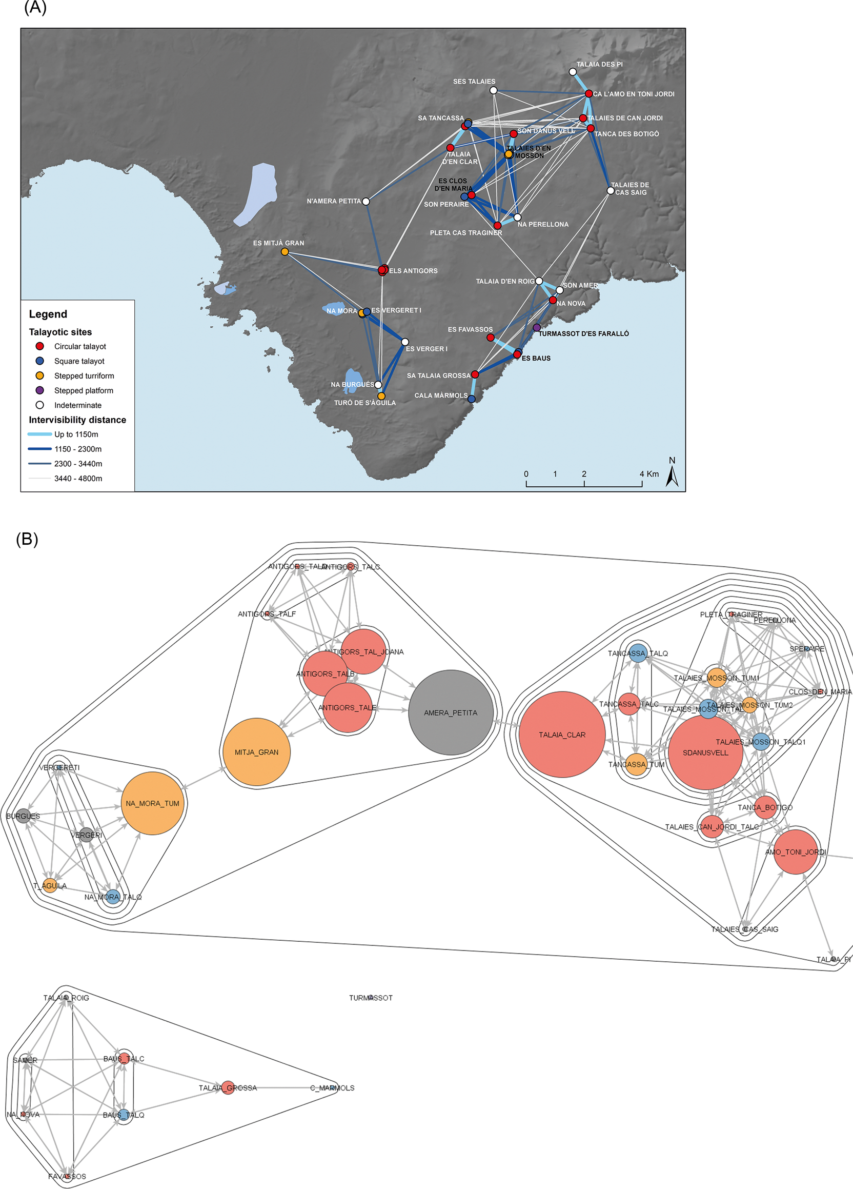 Figure 4. (A) Intervisibility between sites across the southwest area of study. (B) Network analysis with clustering calculated using the Girvan Newman Clustering algorithm. The area of each node is proportional to its betweenness index, and the intervisibility was calculated up to 3440 m distance.