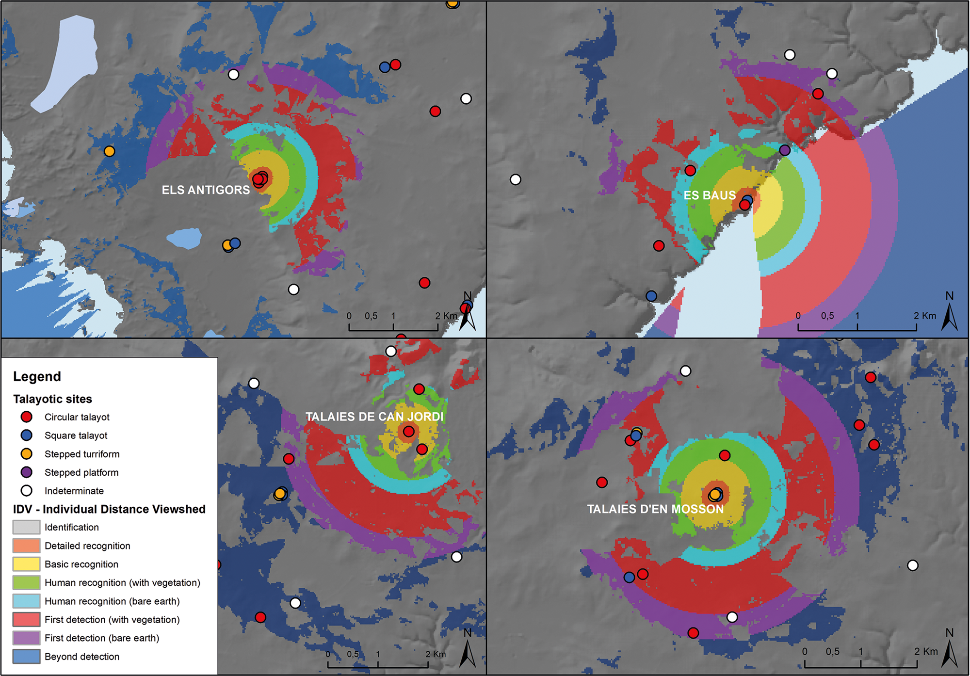 Figure 7. Individual Distance Viewshed (IDV) of the sites of Talaies d'en Mosson, Talaies de Can Jordi, Els Antigors and Es Baus in the southeast area of study.