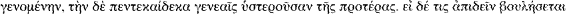 27. It is even easier to see the result in the following way – which may approximate to Dionysius' method of working. He ceases to mention ordinals for the kings after Ascanius: their reigns (given individually) total 387. Adding this composite reign to year T + 43 (Ascanius' last regnal year), we get T + 430 for Amulius' 42nd and last regnal year. The year for part of which he reigned, when the fatal Lupercalia occurred, and for the latter part of which Numitor reigned, is the next one (T + 431), and represents Numitor's first regnal year. Numitor's second regnal year is of course the next one – T + 432 – and in accordance with Dionysius' expression in which T + 1 is protos and so on, T + 432 is ‘the 432nd’. There is no reason why it should be the 433rd. The expression is equivalent to that used of Cato in 1.74.2 ![]()