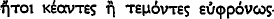 page 56 note 2  The last half of v. 582 appears almost to contradict v. 581. Dindorf deleted v. 582, which Aulus Gellius quotes (with participles for infinitives) as coming from the Prometheus Πυρφόρος;. At Sept. 619 (with ή not καί) the tone is ‘if he speaks at all, it is to the point’. I interpret v. 582 to be an example of polar expression with the opposite emphasis, λέγειυ τά καίρια virtually corresponding to γλῶσσαν εὔφημον φέρειν. The use of καί not ἤ may support this. In any case the expression is clearly a conventional formula, and therefore not an adequate preparation for the chorus’ memorable intervention. Cf. Eur. fr. 413  and the other references there cited by Nauck.