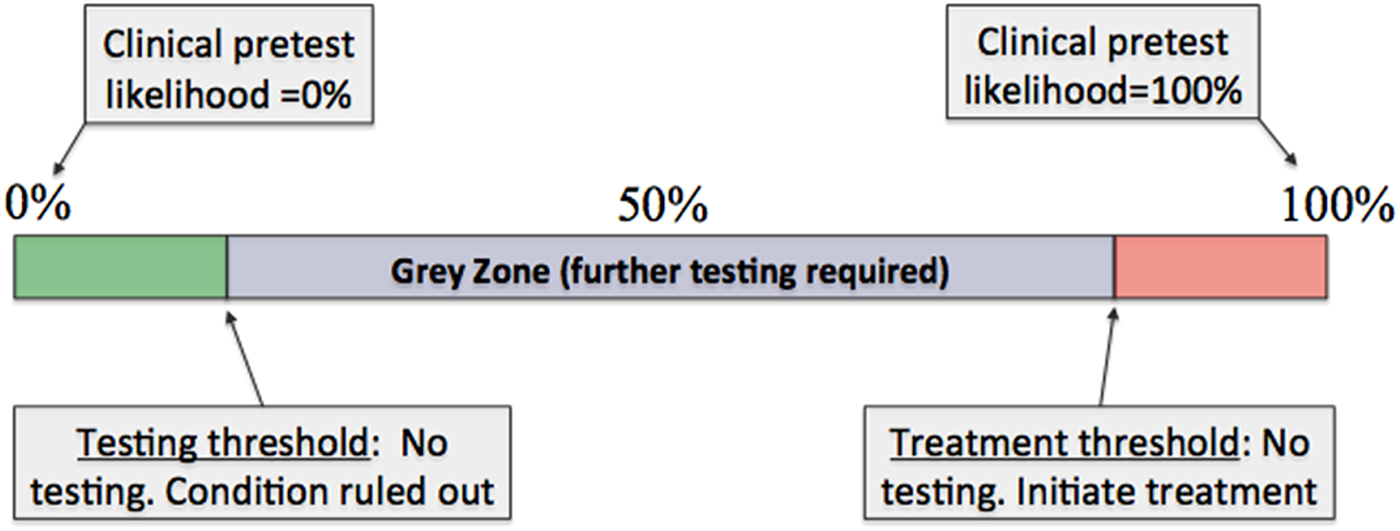 If clinical findings strongly suggest that the patient has the condition of interest and their pretest likelihood falls to the right of the treatment threshold, additional laboratory testing is not needed, and treatment or referral is appropriate. Bayesian principles indicate that, in patients with low pretest likelihood, positive tests are usually false positives, whereas, in patients with high pretest likelihood, negative tests are usually false negatives.Reference Worster, Innes and Abu-Laban5 Consequently, ordering tests after a decision threshold has been achieved can lead to confusion or error.