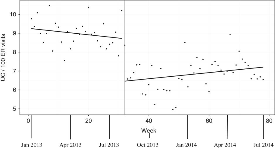 Figure 3 Weekly rates of urine cultures (UC) in the emergency department (ED) per 100 patient visits from December 30, 2012 to June 30, 2014. Note: Scatterplots of weekly UC rates are shown with fitted linear model overlaying. The intervention initiation is shown as a vertical line at the time of maximal intervention impact (week 32, about 3 weeks after the July 15, 2013 intervention).