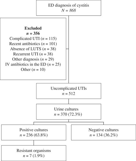 Figure 1 CONSORT diagram of included patients. ED=emergency department; UTI=urinary tract infection; LUTS=lower urinary tract symptoms; IV=intravenous.