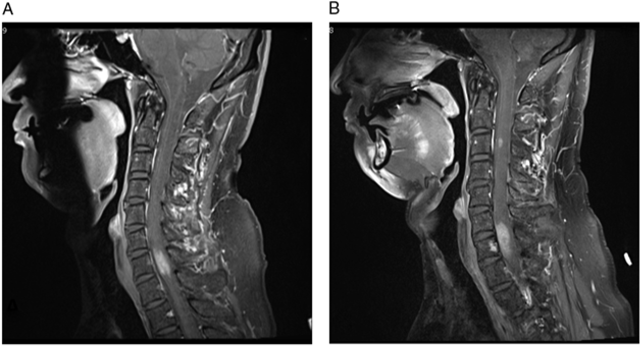 Figure 1: (A–B) T1-weighted post-contrast images demonstrate the progression of cervical spine lesions over time. (A) MRI scan at first admission, demonstrating hyperintense lesion centered at C7. (B) MRI scan 11 months after initial presentation, demonstrating enlargement of the original lesion and a new lesion at C3 level.
