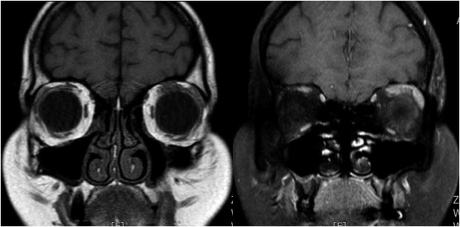 Figure 1b Coronal MRI scan of orbits shows enlargement and contrast enhancement of the left superior rectus and left levator palpebrae superioris.