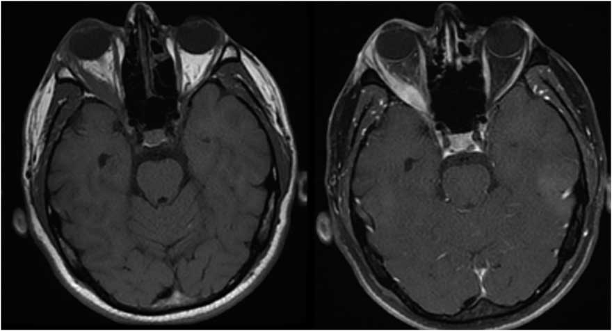 Case 3: A 74-year-old male was admitted with a 1.5-year history of blurred vision and progressive bulging of both eyes. The symptoms started after nasolacrimal duct intubation surgery to treat lacrimal drainage obstruction. He had a past medical history of vision loss in his left eye due to trauma 10 years previous, as well as erosion and perforation of the nasal septum 2 years before. Neurological examination showed bilateral proptosis that was more prominent on his right eye, and his extraocular movements were limited bilaterally in all directions (Figure 3a). MRI of the orbit identified bilateral hyperintensities, enlargement, and contrast enhancement in extraocular muscles. Brain MRI findings included linear dural thickening and enhancement on the anterior frontal and temporal lobes, inflammation and enhancement on the maxillary, frontal, and sphenoid sinuses, and a nasal septum defect (Figure 3b). Investigations revealed a mild increase in CRP and sedimentation rate, slightly low T3 and T4 levels, and normal thyroid-stimulating hormone, CBC, antithyroid antibodies, viral serology, IgG4 levels, ANA, and anti-AChR antibodies. The anti-proteinase ANCA (anti-PR3 ANCA) level was 72.3 U/ml (>20 U/ml), and p-ANCA was found to be positive. Therefore, a diagnosis of orbital inflammation due to GPA was established. Chest CT revealed calcific lung nodules and bilateral apical pleuroparenchymal fibrotic density changes. Histopathological investigation of nasal biopsy revealed chronic inflammation. He was treated with high-dose IV methylprednisolone (1 mg/day for 5 days) followed by 60 mg/day oral prednisolone. He responded with a prompt reduction of proptosis and lid edema and a slight improvement in ocular movement over the 6-month period. Treatment continued with prednisolone tapering and azathioprine.