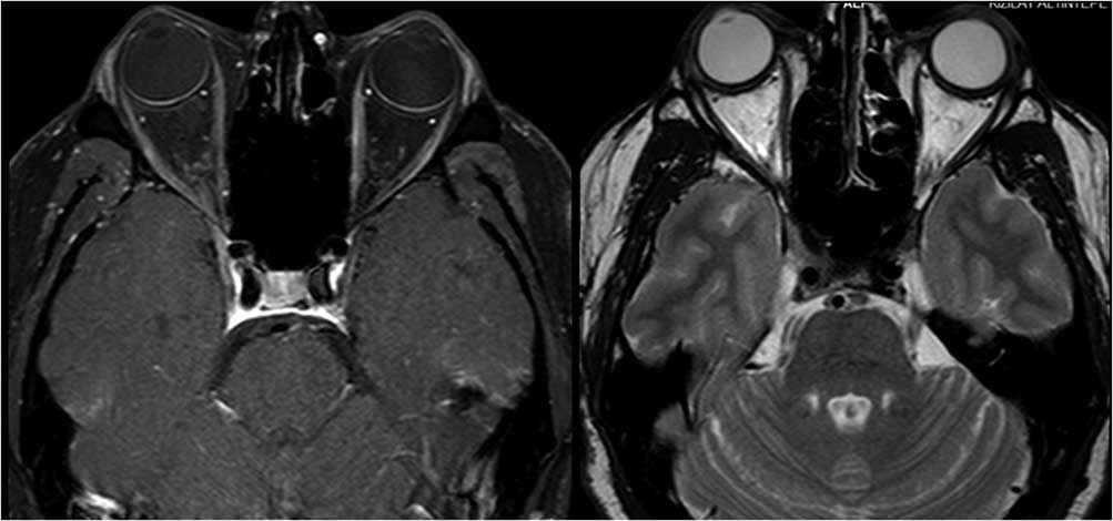 Diagnosis is usually established based on clinical presentation, neuroradiological findings, and exclusion of other causes in conjunction with laboratory results bringing additional clues for specific etiologies, such as in case 3. Contrast-enhanced orbital MRI is the most sensitive diagnostic imaging modality. The classical picture of orbital myositis includes a unilateral thickening of one or two extraocular muscles involving surrounding fat, tendon, and myotendinous junction. Contrast-enhanced T1-weighted images and T2-weighted images with fat suppression that make inflammatory lesions more visible within the orbit should be obtained.Reference Pakdaman, Sepahdari and Elkhamary 2 Histological confirmation with orbital biopsy is recommended in steroid-resistant cases to exclude the presence of neoplastic tissue or lymphoproliferative processes or if the imaging suggests the presence of an orbital tumor.Reference Montagnese, Wenninger and Schoser 1