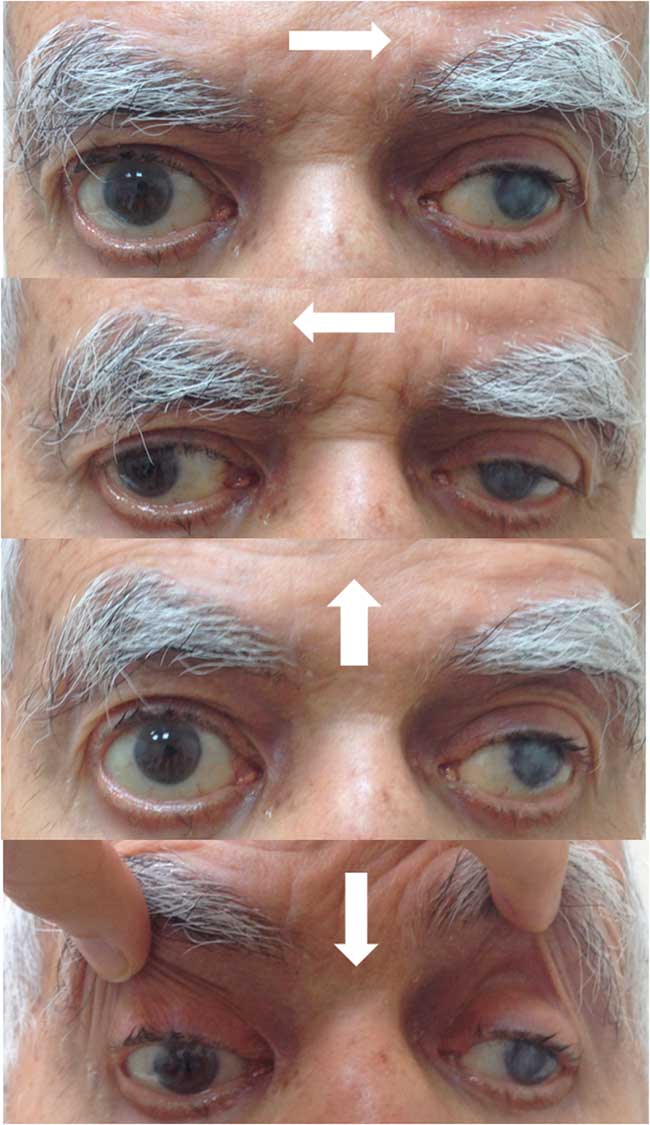 Figure 2a The upper image shows the eyes at primary position. There is right proptosis and periorbital edema. Patient had marked limitation of the right eye in elevation, depression, and adduction, and moderate limitation in abduction.
