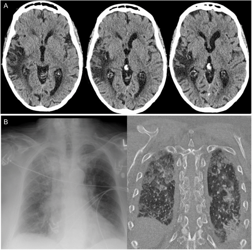 Figure 1: Head and chest imaging at presentation. (A) Axial CT non-contrast head slices revealing previous infarct involving the superior temporal, posterior insular, and parietal lobes and (B) Chest x-ray and CT findings of bilateral alveolar infiltrates consistent with pulmonary edema.