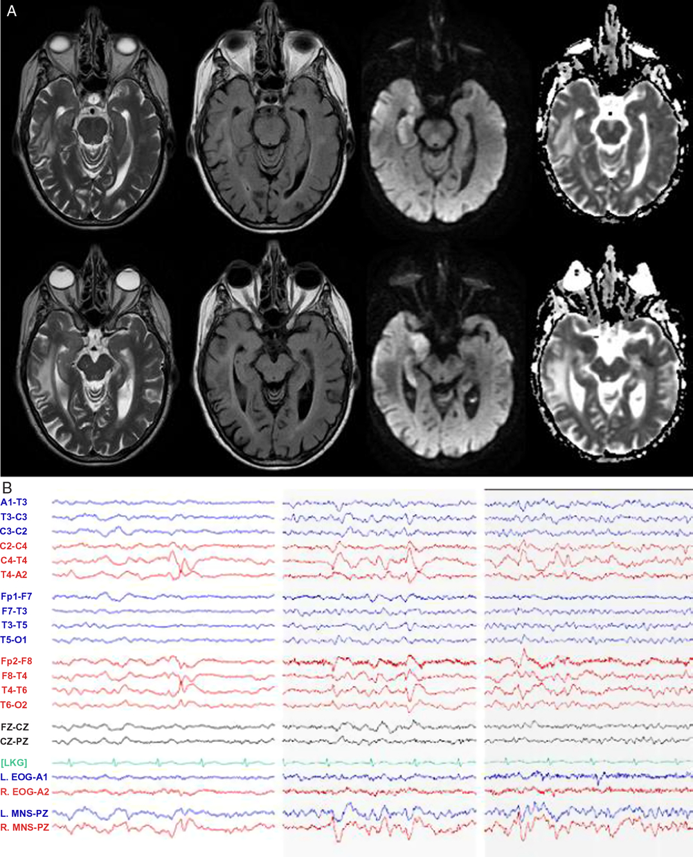 An 83-year-old right-handed woman with medical history significant for right hemispheric infarct secondary to carotid atherosclerosis, and remote follicular lymphoma in sustained remission after treatment with bendamustine and rituximab, presented with acute encephalopathy. This culminated in a witnessed generalized seizure, with laboratory evidence of multi-organ failure at presentation to hospital. She and her family members described a normal morning and afternoon with nausea, dizziness, and dysgeusia developing suddenly in the evening. These symptoms fluctuated over multiple hours, evolving to include hyperventilation, anxiety, and diaphoresis with urinary urgency. Family members describe fluent speech and complaints of "blurry vision” and unsteadiness. Emergency medical services were contacted and found the patient to be afebrile, tachycardic, tachypneic, and hypertensive (blood pressure 220/120 mmHg). She was transferred to the regional hospital and en-route had a 1–2 minute episode of limb stiffening and shaking with altered level of consciousness.