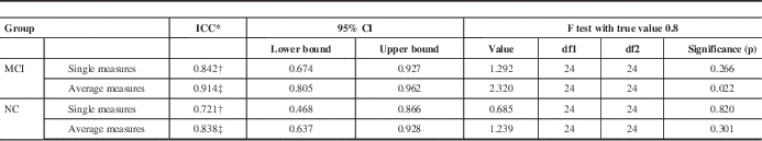 Table 6 Intraclass correlation coefficient comparison of MoCA 1 and MoCA 2 test scores in MCI and NC patients generated using SPSS