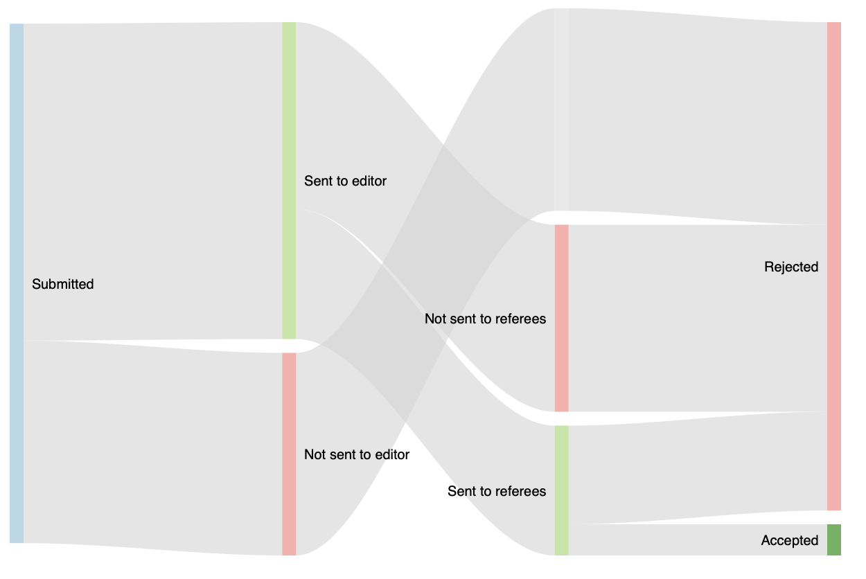 This diagram depicts the volume of decisions made at each stage, for submissions done over the past couple of years.