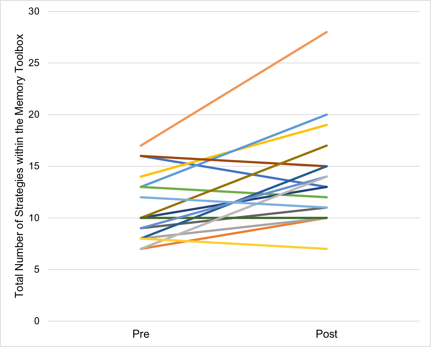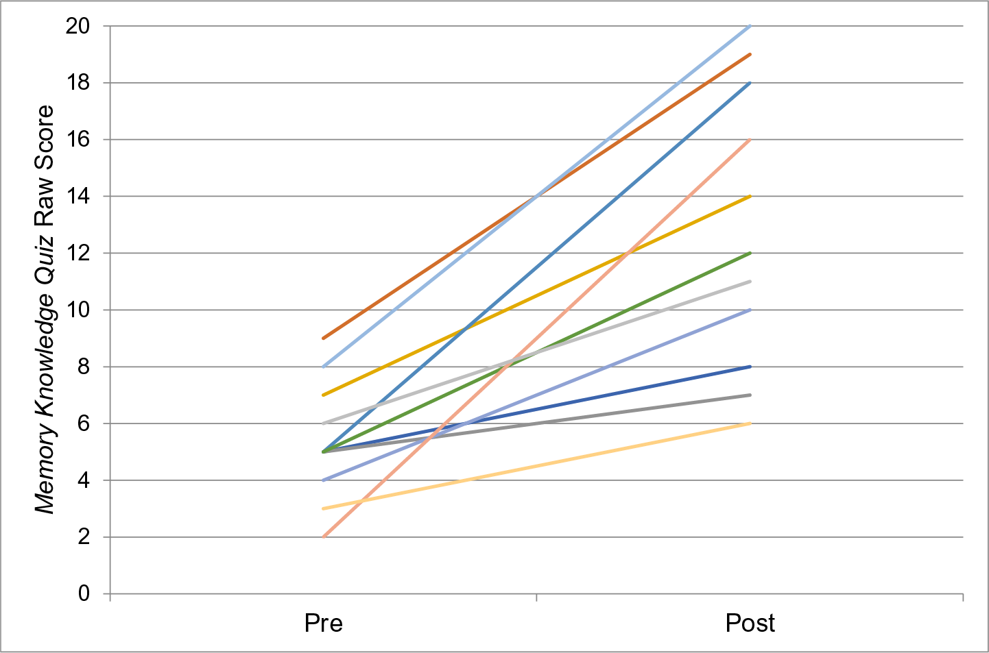 Memory knowledge and strategy use. For the 11 participants who completed the Memory Knowledge Quiz, scores showed a large, significant improvement from before to after program completion t(10) = -5.85, p < 0.001, d = 1.76. Individual scores are shown in Figure 3.