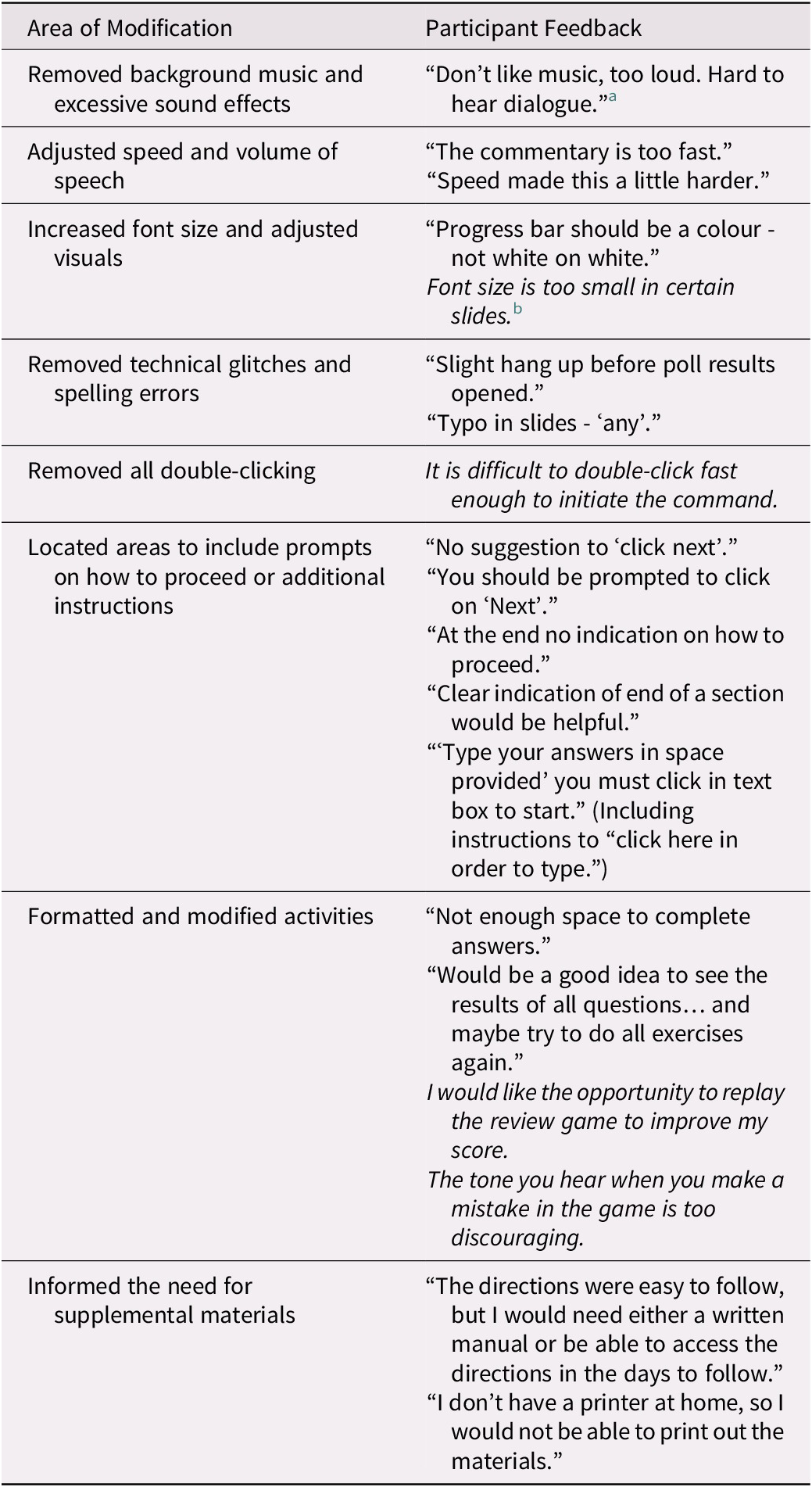 Qualitative feedback (i.e., from the open-ended questionnaire responses and focus group discussion) from all 25 participants identified a number of technological glitches and settings that needed adjustment. Subsequent modifications based on this feedback involved removing background music and excessive sound effects, removing the requirement for double-clicking, increasing font size, adjusting speed and volume of speech, and inserting additional prompts and instructions on how to proceed (e.g., a pop-up indicating “click ‘next’”). See Table 2 for more detailed participant feedback.