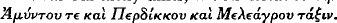 In 334 Amyntas, Perdiccas, and Meleager each commanded a phalanx battalion (cf. Berve i. 114), and it is to the last degree unlikely that they were amalgamated in the command of a single battalion for the attack on Myndus, and never again. For other examples of this peculiar usage, see Tarn ii. 144.