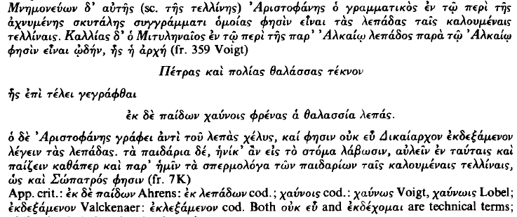 4 We have recently acquired new fragments of Callias, an ancient authority on Aeolic poetry, but they do not help to solve this problem, which vexed unduly Gudeman, R.E. s.v. Kallias no. 23 and especially Wilamowitz, Textg. der gr. Lyriker (Berlin, 1900), pp. 74–6, who recognized the riddle in Alcaeus, but by giving the last sentence to Dicaearchus instead of Aristophanes, was reduced to despair, in which he is followed by Wehrli on Dicaearchus fr. 99.Google Scholar