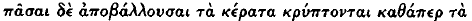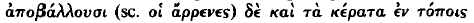 p. 127,9–10L, and Aristophanes keeps the feminine in the epitome until he comes to 611b 26, where Aristotle is once again speaking of does. From H.A. 611 a30 to 611 b20 Aristotle is speaking of the growth of horns on the male, from which Aristophanes has preserved two sentences 127. 12–15L, in which he has altered the original to the feminine. But most revealing is the one passage where Aristotle in an aside says (H.A. 611a25): ![]()