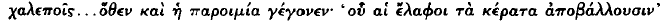 The proverb meant – contrary to the explanation of Demo found in the paroemiographers - ‘so remote as to be nowhere’ (Plut. Mor. 403d, 700d-a sympotic zetema), and nearly all our authorities, even when dependent on Aristotle (Ael. H.A. 6. 5), use the masculine; even R.E. s.v. Hirsch 1940 accidentally changes to masculine, while Zenobius 5. 52 quotes feminine and explains masculine. The tendency, therefore, is always to remove the feminine, and it must go back to a time when does were actually thought to have horns, or perhaps an adynaton was intended.